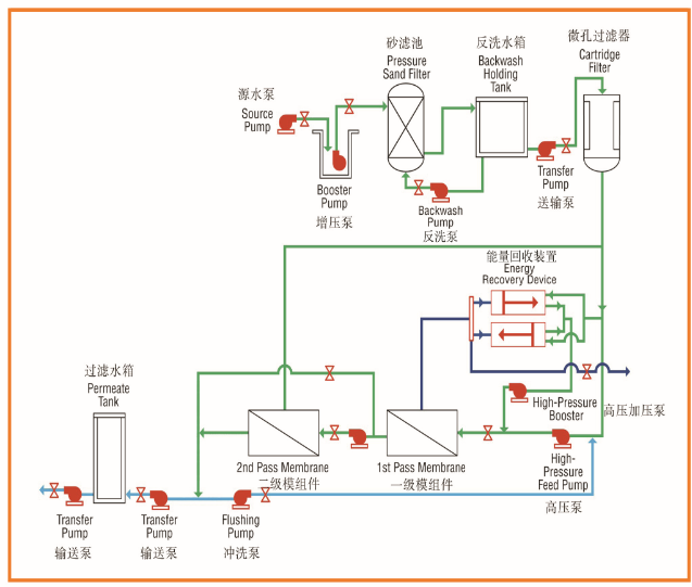 根據(jù)我國的實際情況,絕大多數(shù)海水淡化裝置均采用RO膜法海水淡化,簡要工藝流程如下: